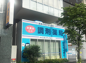 南口を出ましたら左手に見える交番の向こう側、1Fに『日本メディカル』という青色の看板の調剤薬局が入ったビルになります。